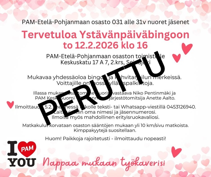 Tarkempaa tietoa toimintasuunnitelman tapahtumista lähempänä ajankohtaa PAM-lehdessä, paikallislehdissä tai ammattiosaston kotisivuilla https://pamep.pamosasto.fi/tapahtumat/ tai Facebookista PAM -Etelä-Pohjanmaan osasto 031 ry tai järjestävän paikallisosaston puheenjohtajalta tai sihteeriltä (kts. yhteystiedot)