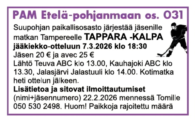 - Matka jääkiekko-otteluun Tampereelle (keväällä) – järjestäjänä Suupohjan paikallisosasto