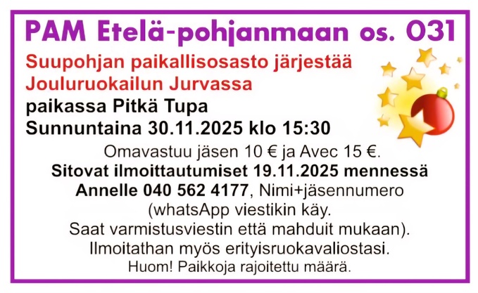 PAM Etelä-Pohjanmaan osasto 031 jäsenille la 29.11.2025 klo 18 Pikkujoulu OnnenKivi ravintolan yläkerrassa, Tuurin kyläkauppa, Onnentie 7, Tuuri.